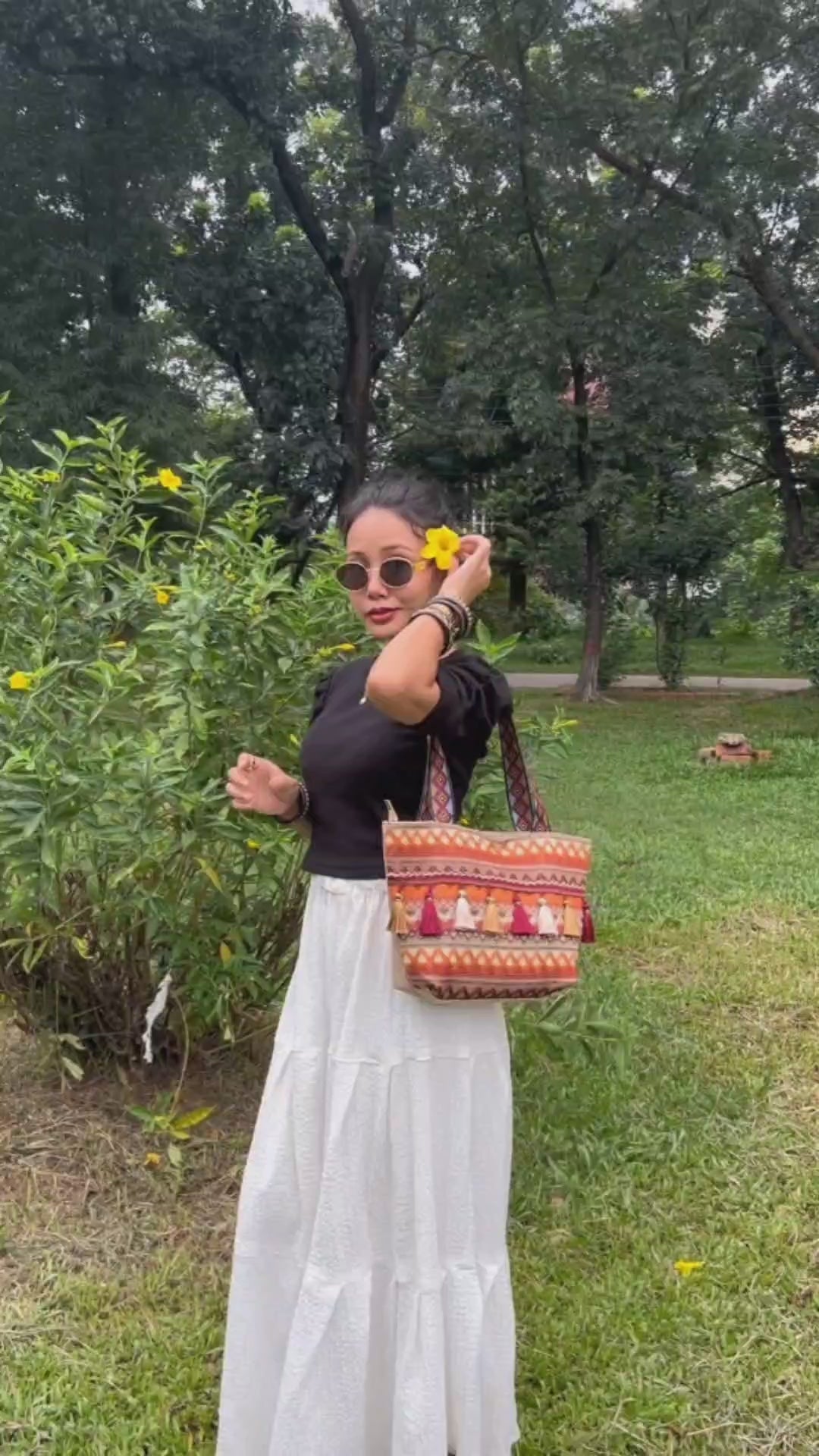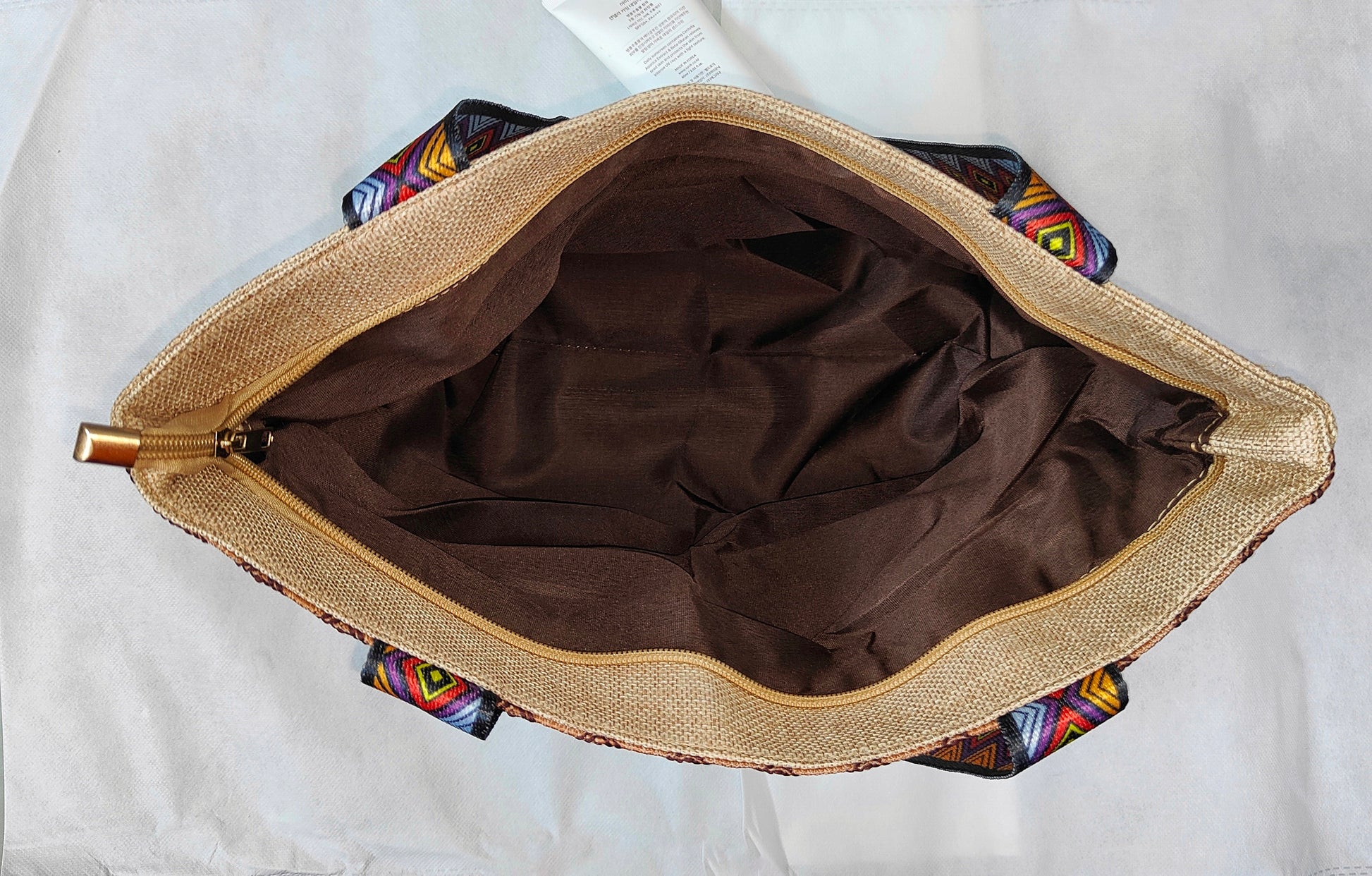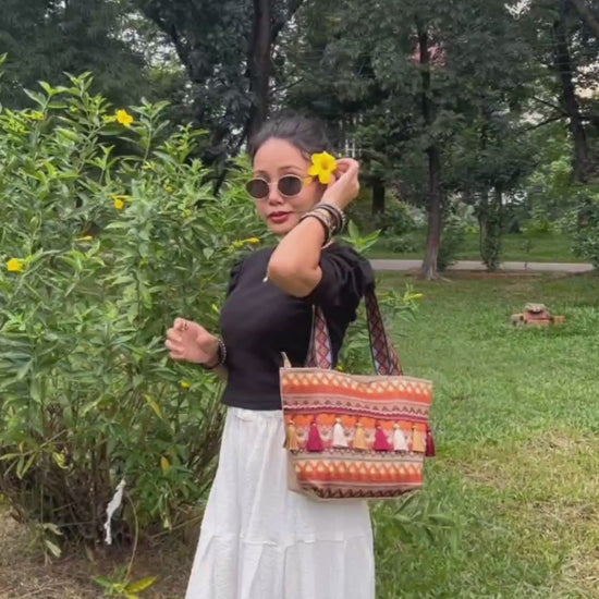 A perfect fusion of tradition and trend. This eye-catching and colorful fabric bag with playful tassels.Ā