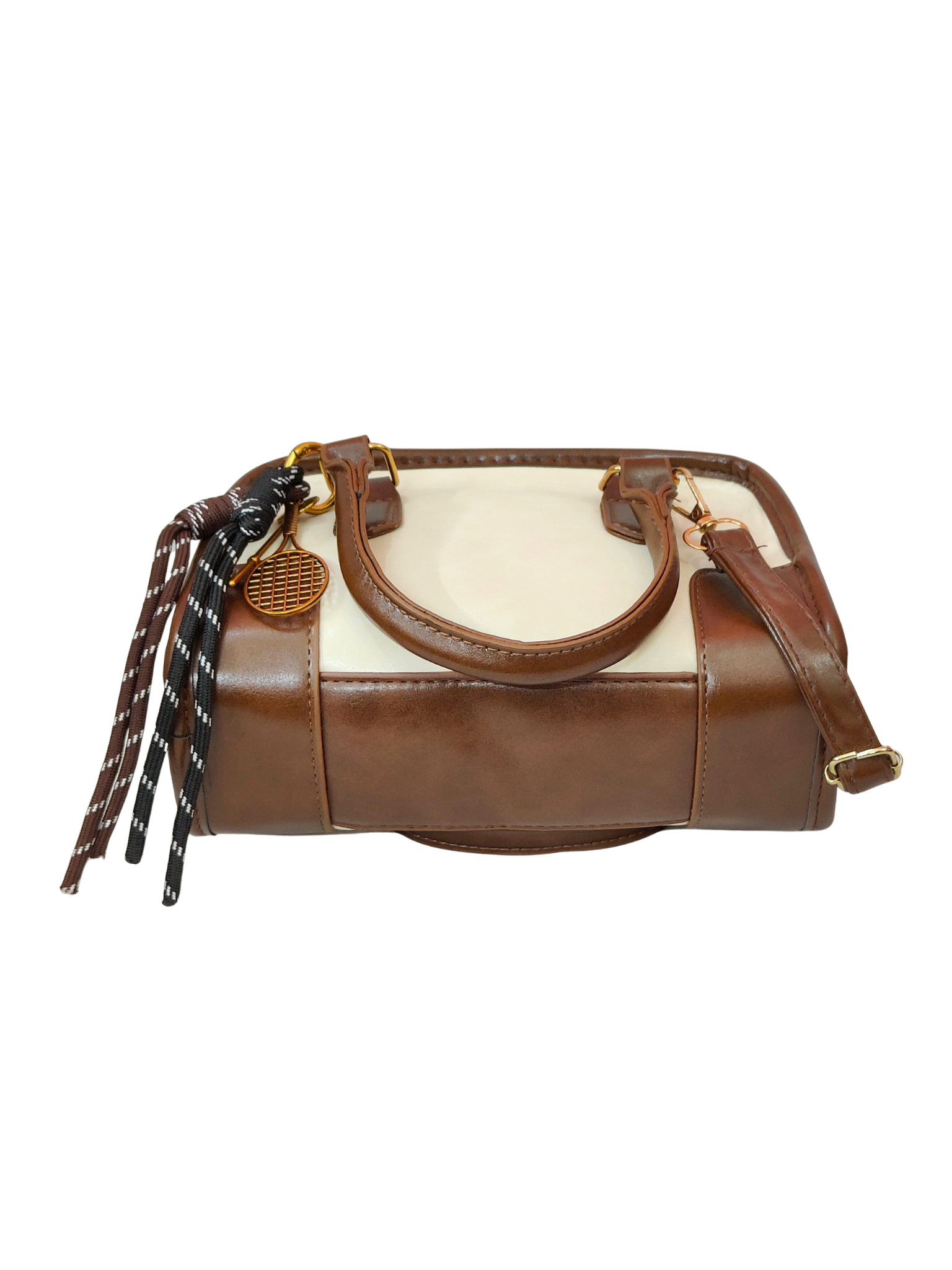 It comes in a Chic Cream and Rich Brown design. Features a comfy, detachable, and adjustable crossbody strap, plus a Cute Charm gift for you!